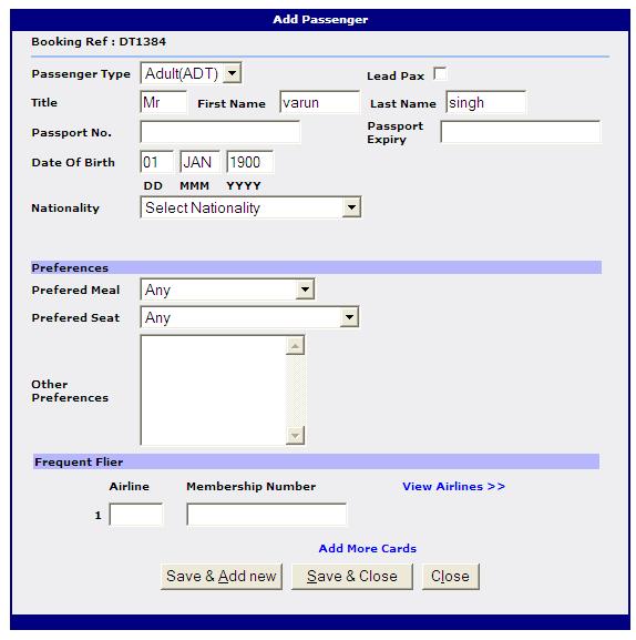 A passenger can be cancelled from the booking if any payment has not been received or any voucher has not been issued. Agent can add the passenger details by clicking the “Add PAX” icon on the PAX tab on the booking details screen. Information like title, first name, last name are compulsory for all passengers. Passengers can be categorized as: A Passenger above 12 years of age is considered as an adult passenger. Only an adult passenger can be a lead passenger for a booking. Agent can also enter Meal and Seat preferences for all adult passengers. Frequent Flyer information can also be added for all adult passengers. The agent can lookup the air line code and select the airline from the list for frequent flier. The membership number has to be entered manually. A Passenger between 2 and 12 years of age is considered as a child passenger. Entering date of birth is mandatory for all child passengers. A Child passenger cannot be selected as the lead passenger and they don’t have any frequent flyer information. A passenger below 2 years of age is considered as an infant passenger. Entering date of birth is mandatory for all infant passengers. Each infant must be accompanied with an adult passenger. More than one passenger can be added to the system without closing the screen. |