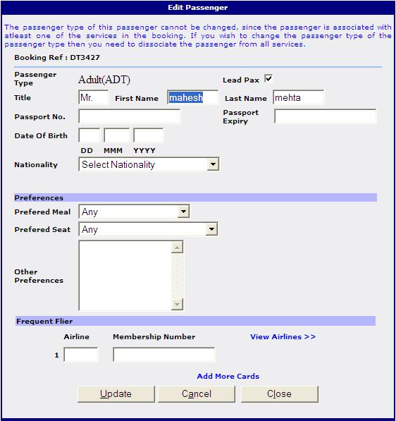 | Modifying passenger details The details of a passenger cannot be modified, if any of the vouchers for any of the products in the itinerary have being generated, or the air tickets have been processed or the passenger has been cancelled from the booking. If the agent needs to change the lead passenger from the booking then the he will have to specify a new lead passenger for the booking as its mandatory to have one lead passenger per booking. Incase the agent changes the passenger type (for e.g. from Adult to child) then the respective change in the air fare would have to be incorporated manually in all products/ itineraries effected by this change. (E.g. manually changing adult fare to child fare) |