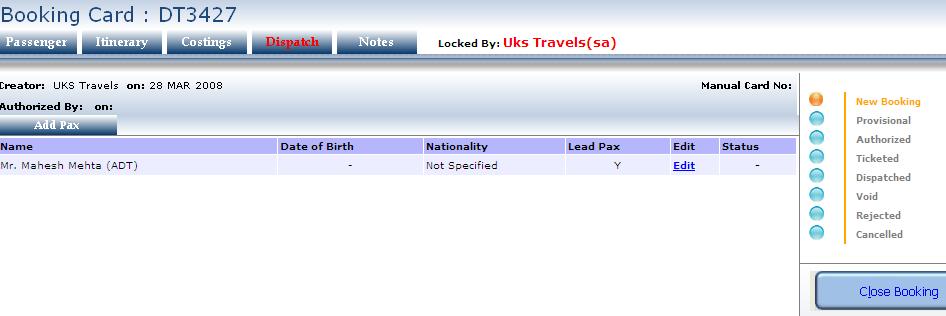 | Each booking must have passenger details before it could be sent for authorization. For manually created bookings only the number of passengers mentioned can be added to the booking. For bookings imported from GDS, passenger details are imported from the GDS. At any point of time additional passengers cannot be added to the booking. |